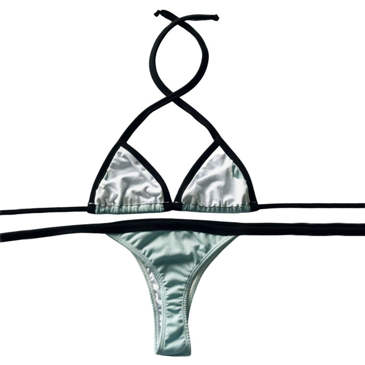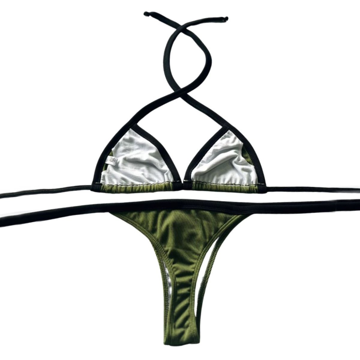 El corpiño de triángulo movible, forrado y con tiras para atar en la espalda, permite regular el calce según tu forma y tu comodidad. La bombacha less no cavada, forrada y regulable, estiliza de manera natural y se adapta a tus movimientos.