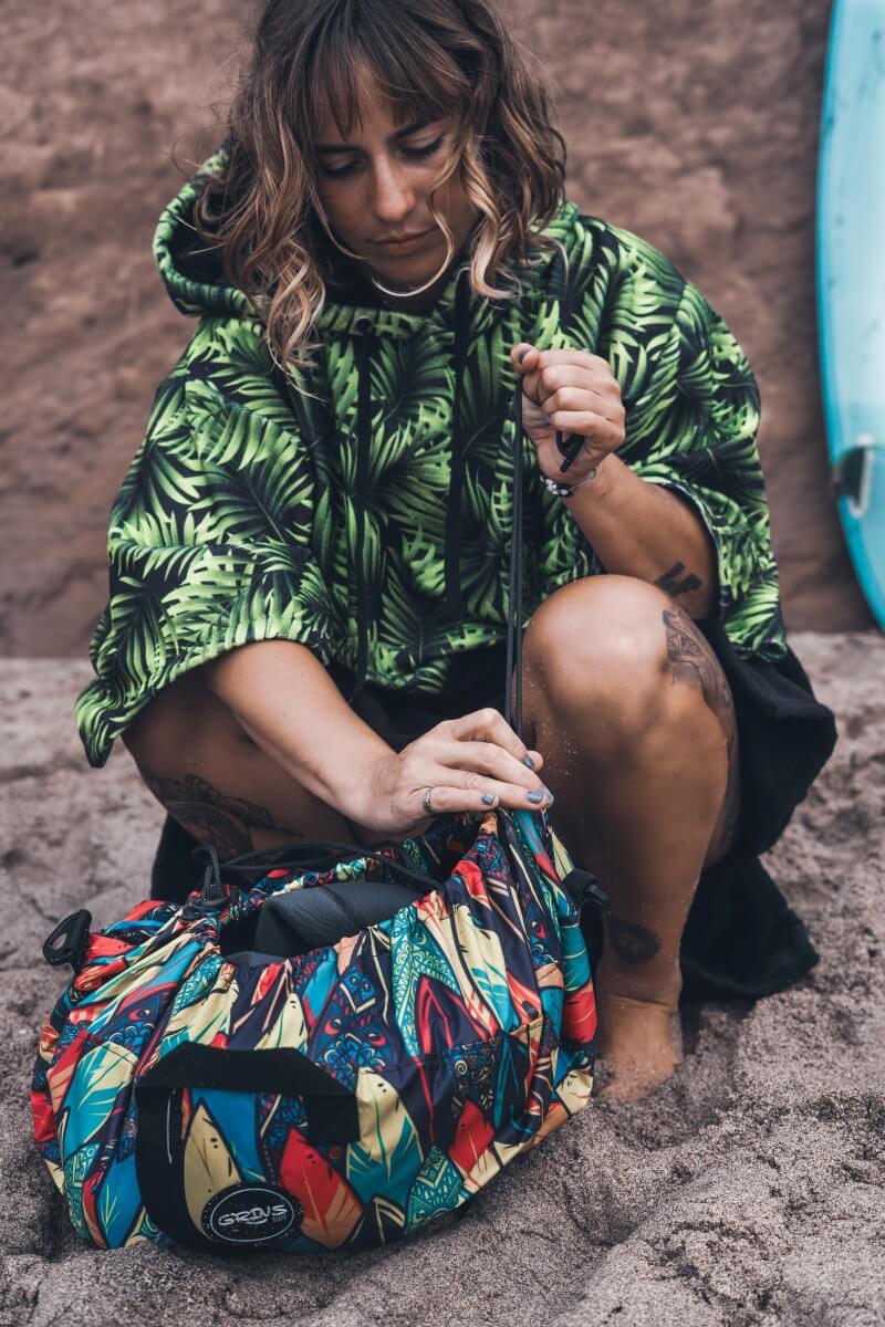 • Función: Permite cambiarse cómodamente sin ensuciarse; luego se convierte en bolso para guardar el neoprene y accesorios mojados.