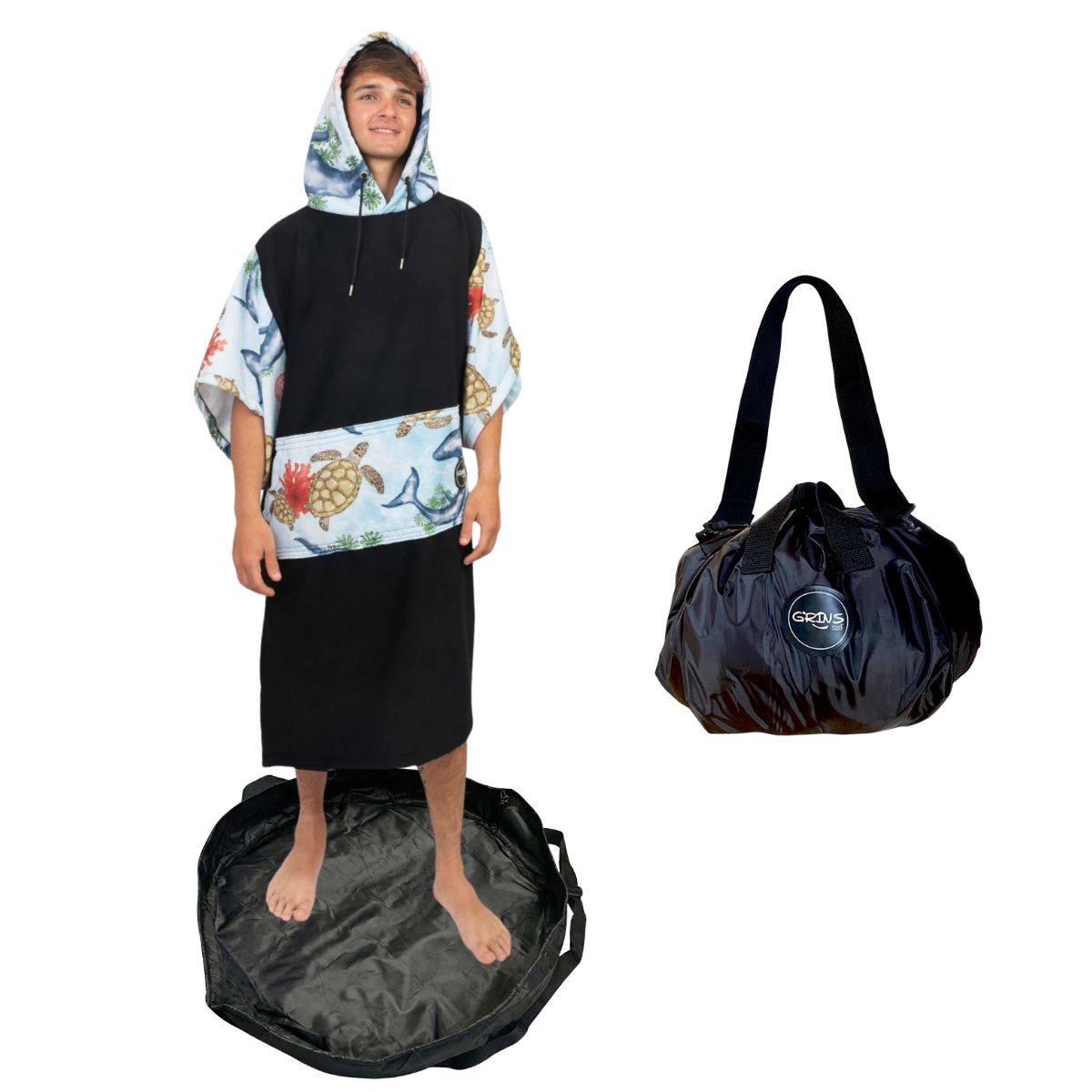 • Change Mat: Este cambiador te espera a la salida del agua: firme, limpio y listo para vos. Te cambiás sin pisar arena, barro ni piedras, después lo cerrás para llevar el neoprene mojado sin enchastrar nada. Es impermeable, práctico y fácil de llevar. Dejás todo lo mojado adentro, lo enrollás, lo cerrás… y listo! Llevalo como te quede más práctico, como bolsa con sus manijas, o como bolso con su correa regulable.