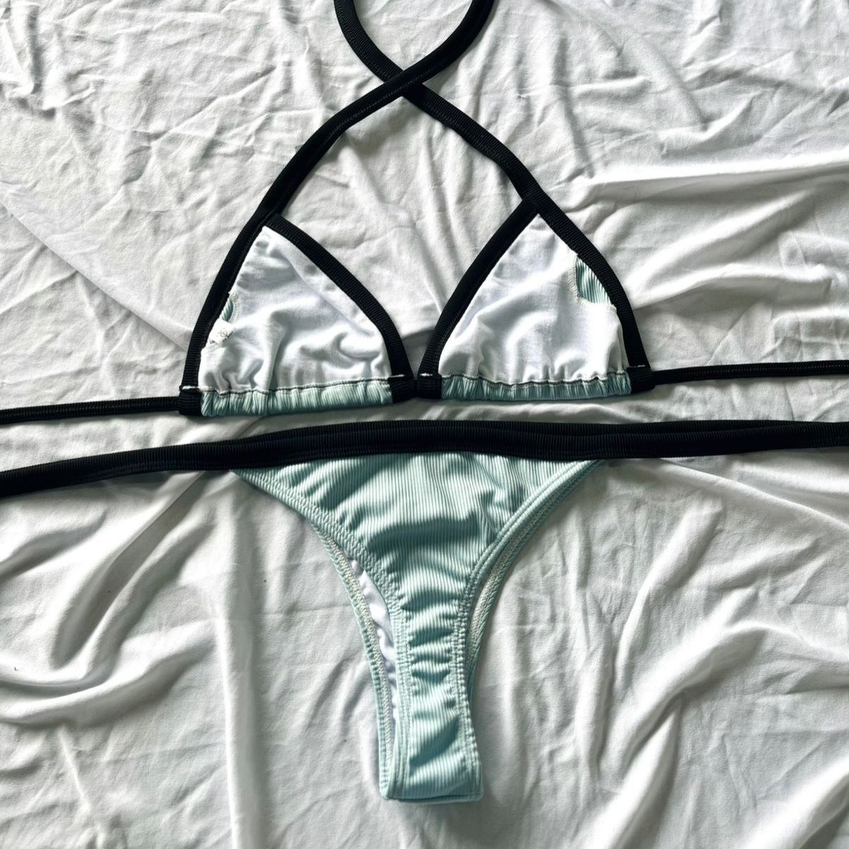 El corpiño de triángulo movible, forrado y con tiras para atar en la espalda, permite regular el calce según tu forma y tu comodidad. La bombacha less no cavada, forrada y regulable, estiliza de manera natural y se adapta a tus movimientos.