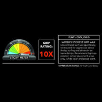 La fórmula Punt ofrece adhesión a un máximo nivel. Con una clasificación de agarre 10X que seguramente te mantendrá bloqueado y cargado. Hecho con la mezcla de más alta calidad de pegatinas naturales /ceras minerales naturales. Utilizar junto con la capa base para obtener mejores resultados. Especialmente formulado para el surf agresivo por encima del labio y olas extremas. Doble envuelto para su protección. Para temperaturas inferiores a 20°.