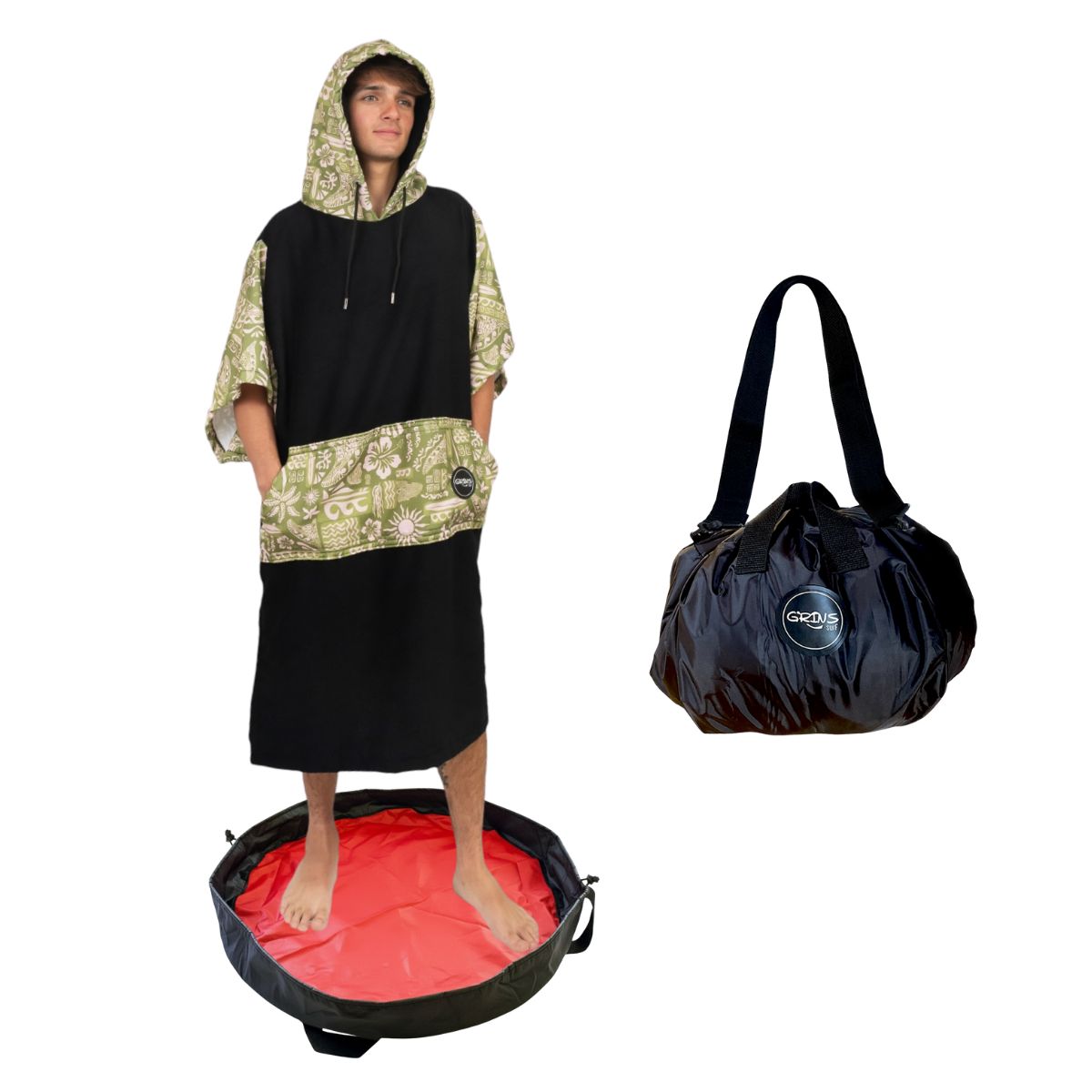 El Combo Black Hawai combina dos esenciales que te acompañan en cada metida, cada viaje y cada escapada al agua: el Poncho Cambiador y el Change Mat Cambiador.