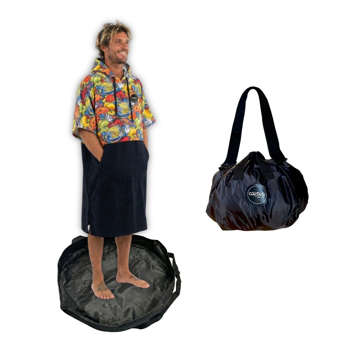 • Change Mat: Este cambiador te espera a la salida del agua: firme, limpio y listo para vos. Te cambiás sin pisar arena, barro ni piedras, después lo cerrás para llevar el neoprene mojado sin enchastrar nada. Es impermeable, práctico y fácil de llevar. Dejás todo lo mojado adentro, lo enrollás, lo cerrás… y listo! Llevalo como te quede más práctico, como bolsa con sus manijas, o como bolso con su correa regulable.