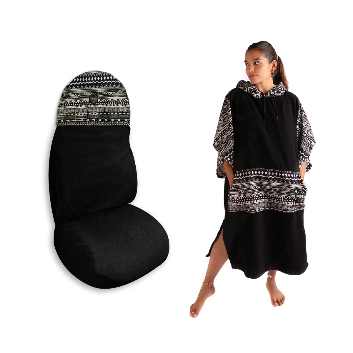 El Combo Black Arena combina dos esenciales que te acompañan en cada metida, cada viaje y cada escapada al agua: el Poncho Cambiador y la Funda Protectora de asientos.