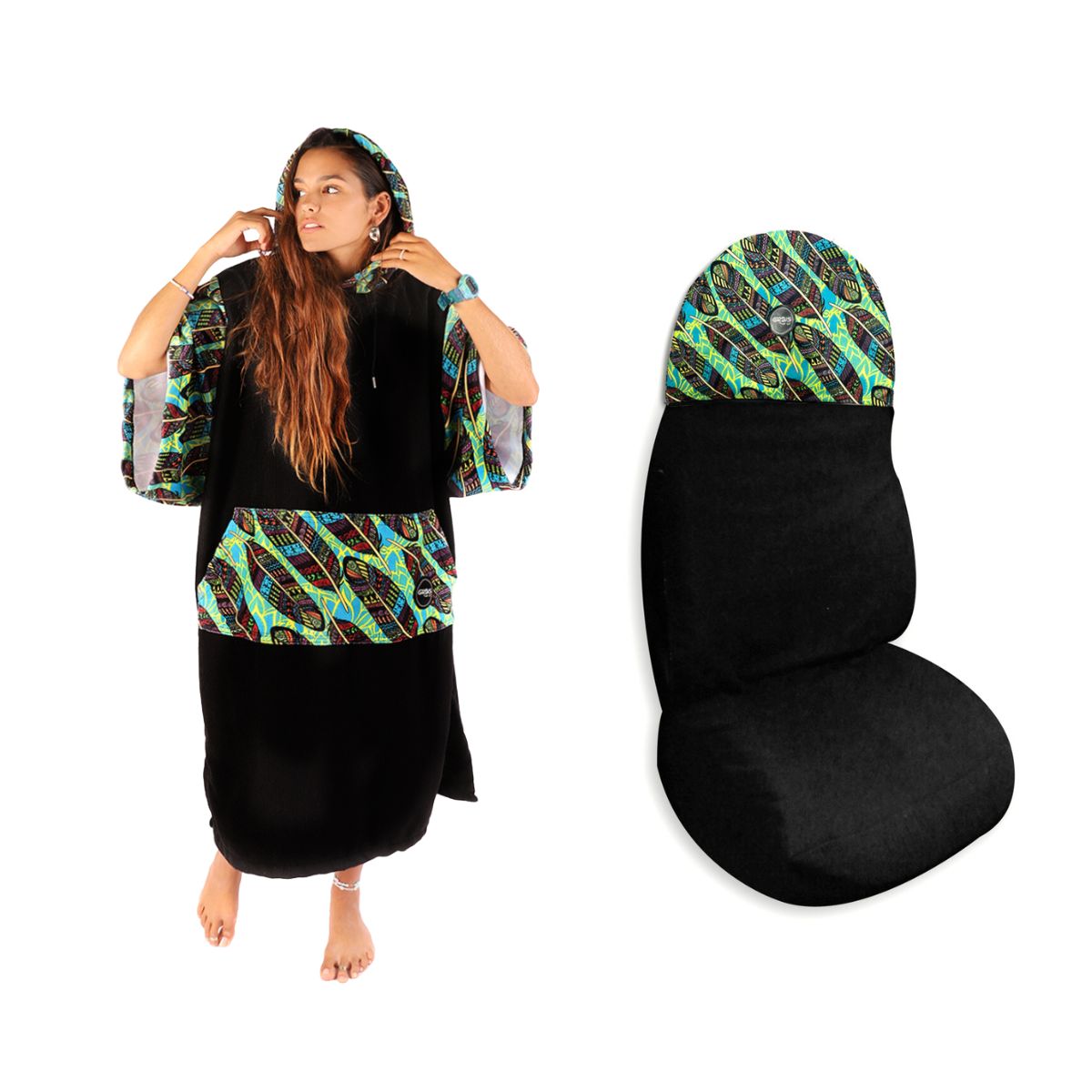 El Combo Black Hulu combina dos esenciales que te acompañan en cada metida, cada viaje y cada escapada al agua: el Poncho Cambiador y la Funda Protectora de asientos.