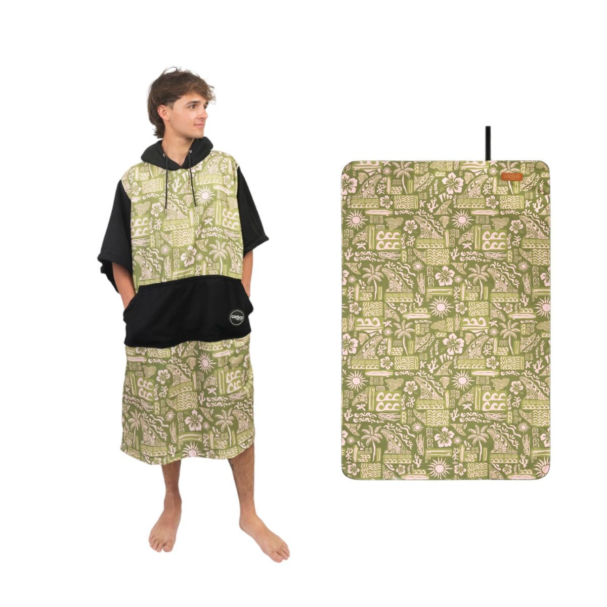 El Combo Hawai combina dos esenciales que te acompañan en cada metida, cada viaje y cada escapada al agua: el Poncho Cambiador y el Toalla de Microfibra.