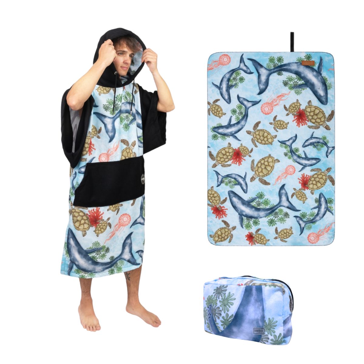 El Combo Oceánico combina dos esenciales que te acompañan en cada metida, cada viaje y cada escapada al agua: el Poncho Cambiador, Toalla y Neceser organizador de Microfibra.
