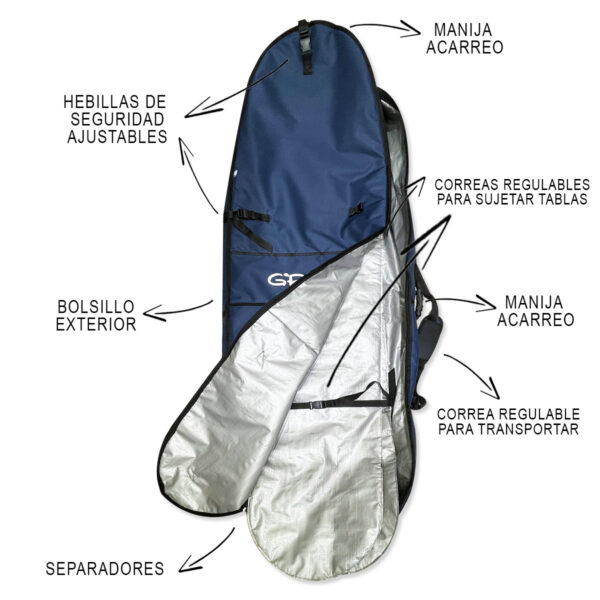 • Seguridad y Traslado: Hebillas en los extremos y laterales para ajustar. Y dos correas internas para asegurar las tablas.
