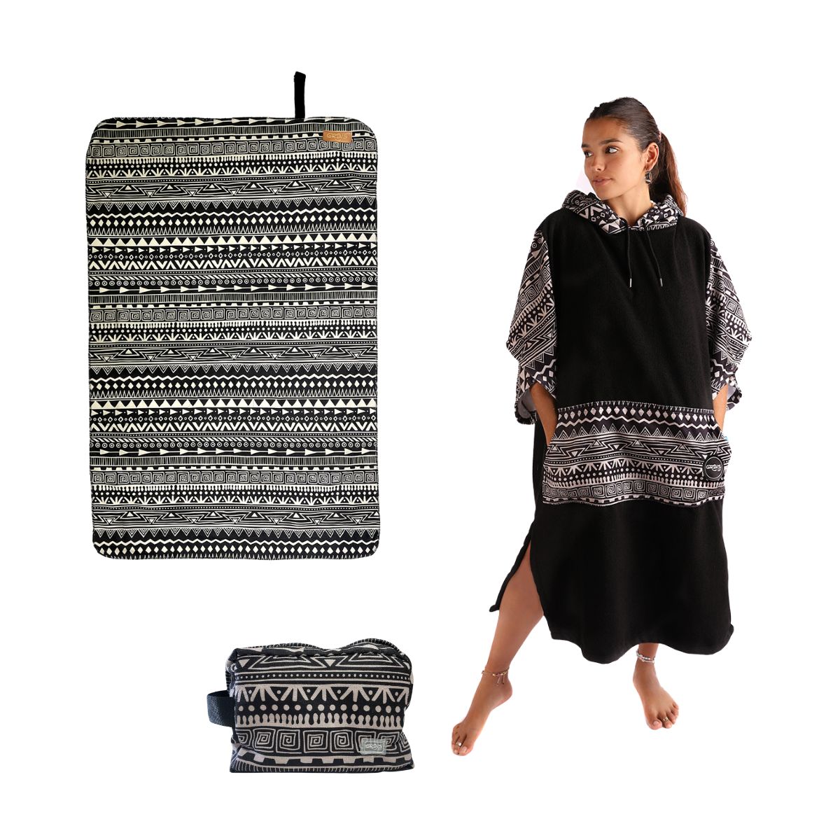 El Combo Black Arena combina dos esenciales que te acompañan en cada metida, cada viaje y cada escapada al agua: el Poncho Cambiador, Toalla y Neceser organizador de Microfibra.