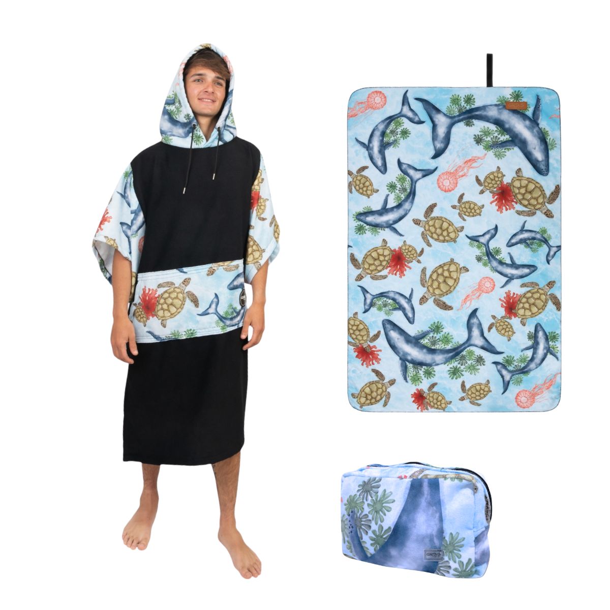 El Combo Black Oceánico combina dos esenciales que te acompañan en cada metida, cada viaje y cada escapada al agua: el Poncho Cambiador, Toalla y Neceser organizador de Microfibra.