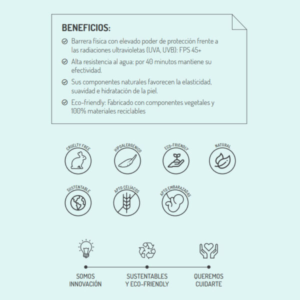 • Barrera física con elevado poder de protección frente a las radiaciones ultravioletas (UVA, UVB): FPS 45+