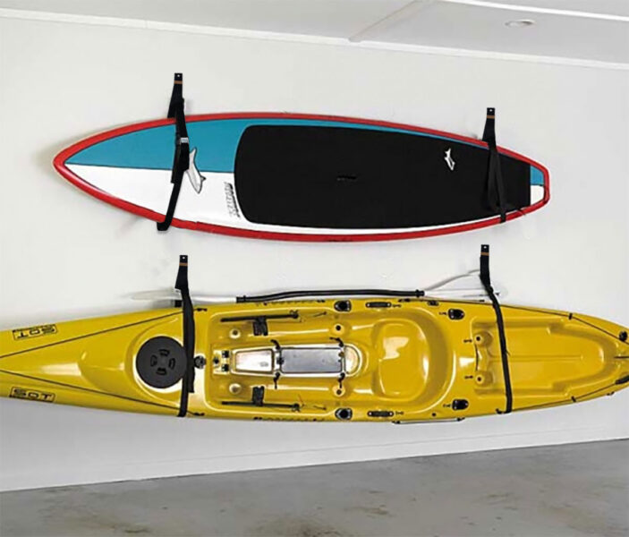 Este soporte te permite organizar y liberar espacio, permitiendote colgar en la pared fácilmente tu Kayak, tabla de surf, tabla de paddle sup, etc.